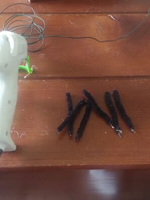 Zde jen na začátku drátku malinko lepidla, obmotáme drátek a pak na konci opět trochu lepidla. Délka 6.5 cm. Malinko delší konec na přidělání vousků. Na každé straně 3 vousky.