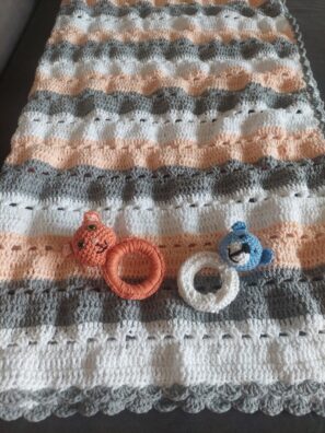 - Nádhernou háčkovanou deku do kočárku nebo postýlkyvel. 80x100 cm