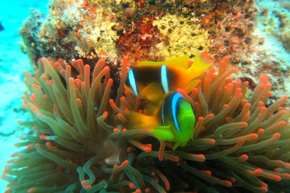 Páááááni, tak to bylo něco. Nejkrásnější věc, kterou jsem mohla zažít a věřím, že ještě zažiju. Vyskákali jsme z lodi do otevřeného moře. A? Ponořila jsem hlavu a nemohla už ji vytáhnout, jak jsem byla uchvácena tou krásou dole. Měla jsem dříve akvárko s rybičkami a tohle bylo jedno velikánské akvárko. Tak nádherné, tak barevné, tak živé. A to TICHO. Wau, páni, to se ani nedá popsat slovy. Shora jsem i sledovala potapěče pode mnou. A synek? No jasně, že tam skočil se mnou a byli jsme tak nadšení, že jsme úplně zapomněli hlídat loď. Takže pochopitelně  jsme se vzdálili hodně daleko, až na nás hulákali z lodi, ať plaveme zpátky, že už jsme moc daleko.