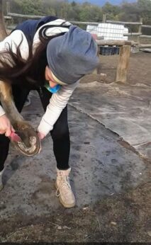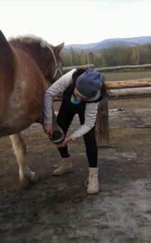Jaké to učení bylo? Ty vogo, tolik srandy si nedovedete asi představit. Přišla jsem natěšená, ale také plná obav. Učila jsem se od začátku. Nejdříve vyčistit celého koně. S kartáčem to byla  pohoda, potíž přišla s kopyty....když nemáte vnitřní stabilitu, jste po rozchodu úplně v čudu roztřesení a mnoho dalších myšlenek a emocí, které ve mě byly, si dokážete představit, že když máte vyčistit kopyta tvrdohlavému koni, že vás jen tak neposlechne. Cítí to, že nemusí. Cíti, že jste slabé a že si s vámi může hrát a dělat šprťouchlata. Teď se tu usmívám, jak báječná učitelka Sára pro mě byla. Stála s nohama pevnýma jako skála a ne a ne je zvednout. Pomohl až přísný zásah Hanky, jo tu poslouchala. To by šlo čištění jsem se postupně naučila a i po pár týdnech mě u čištění kopyt poslechla.